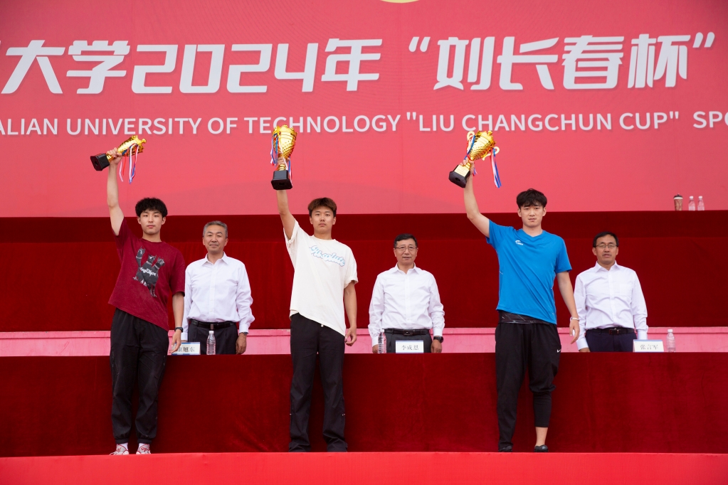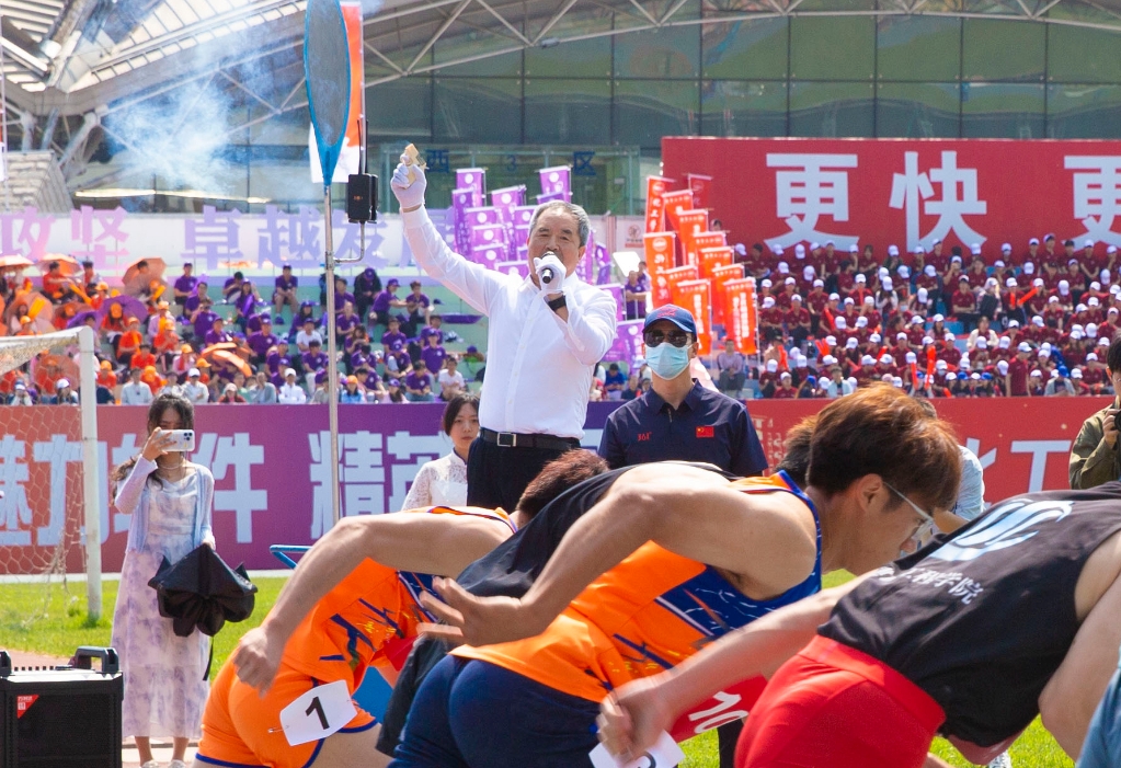 校长贾振元宣布大连理工大学2024年“刘长春杯”田径运动会开幕,并为学生男子100米决赛发枪。