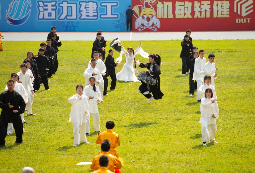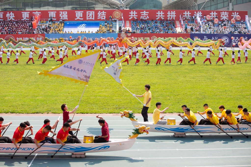 七十五载逢盛世,青春奋进向卓越。由22个学院学子组成的啦啦队舞动芳华,开启了“龙韵中华、逐梦大工”中华民族传统体育项目开幕式表演。附校师生们表演的中国传统健身功法《八段锦》,尽显青少年蓬勃的朝气和活力。蛟龙出海上下翻飞、灵狮舞动跳跃翻滚,由体育课专项班和体育社团带来的舞龙,舞狮,陆上龙舟表演,一上场就点燃了全场热情。从持戈而立到止戈为武,武术单刀和朴刀表演,彰显民族传统体育魅力。“韵者,美之极”,由离退休教师和学子们表演的太极拳、武术毛笔、功夫扇等节目,在一招一式、一拳一路中,传递中华民族优秀文化的独特魅力。《丹霞映扇》响扇健身操既强身健体又展现中华悠久文化内涵。最后,师生齐唱《未来我来》,深情表达对美好未来的憧憬和对学校75周年华诞的祝福,将全场气氛推向高潮。