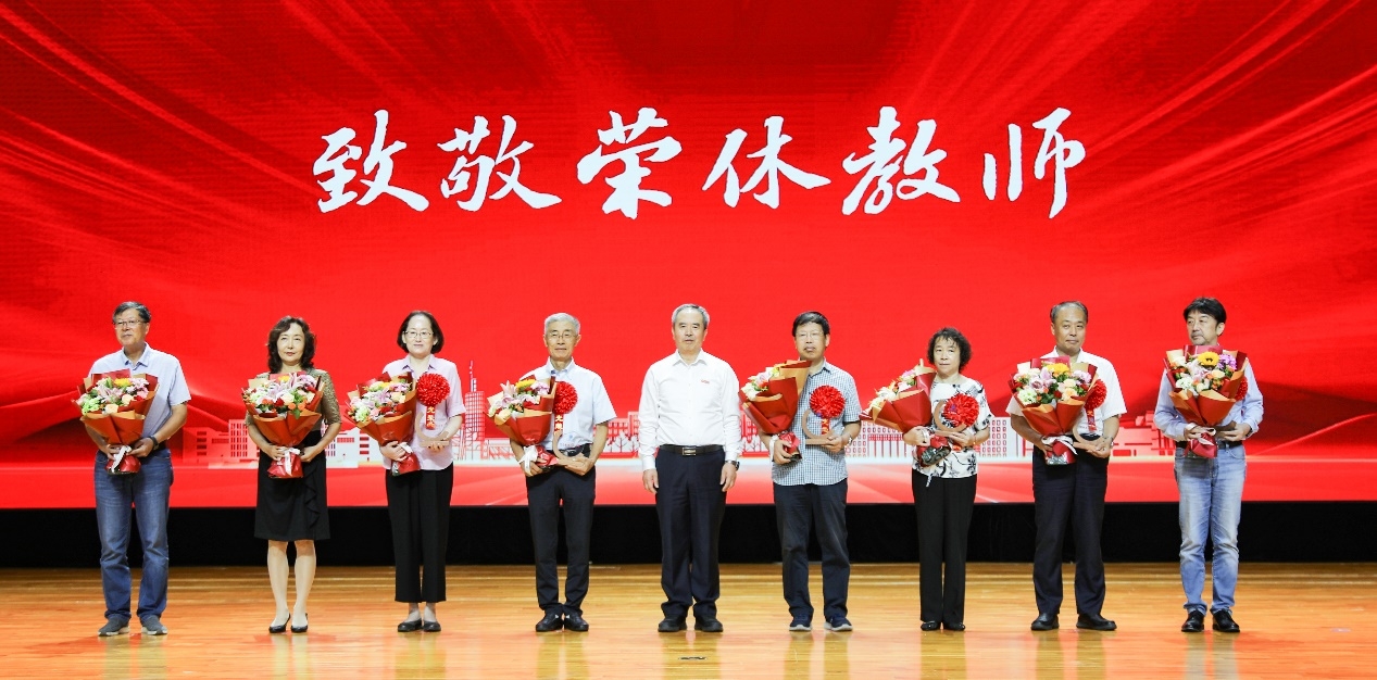 校党委书记项昌乐为从教40年教师代表颁发纪念章,校长贾振元为荣休教职工代表颁发纪念牌,感谢他们对学校建设和教育事业的辛勤付出和卓越贡献。