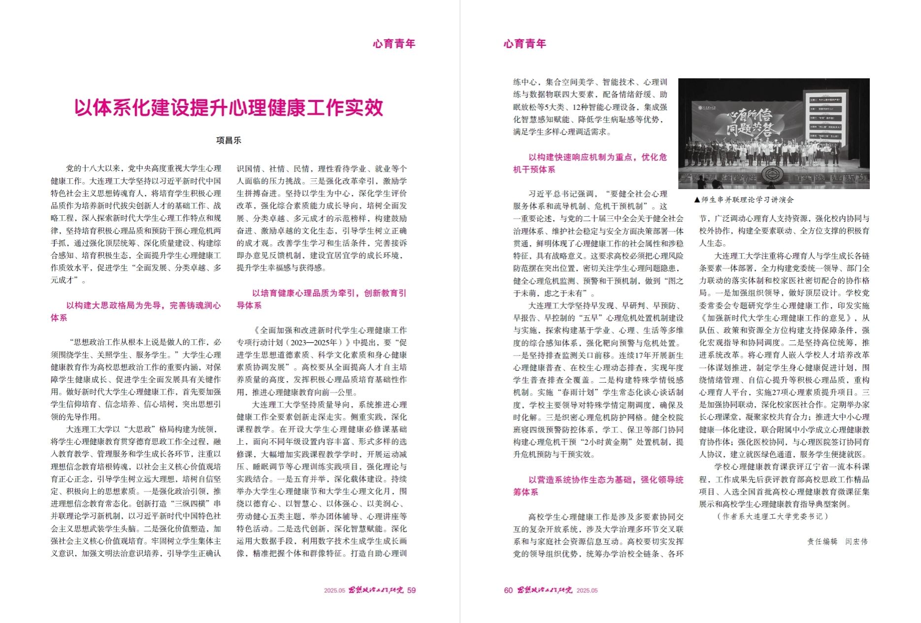 党的十八大以来,党中央高度重视大学生心理健康工作。大连理工大学坚持以习近平新时代中国特色社会主义思想铸魂育人,将培育学生积极心理品质作为培养新时代拔尖创新人才的基础工作、战略工程,深入探索新时代大学生心理工作特点和规律,坚持培育积极心理品质和预防干预心理危机两手抓,通过强化顶层统筹、深化质量建设、构建综合感知、培育积极生态,全面提升学生心理健康工作质效水平,促进学生“全面发展、分类卓越、多元成才”。